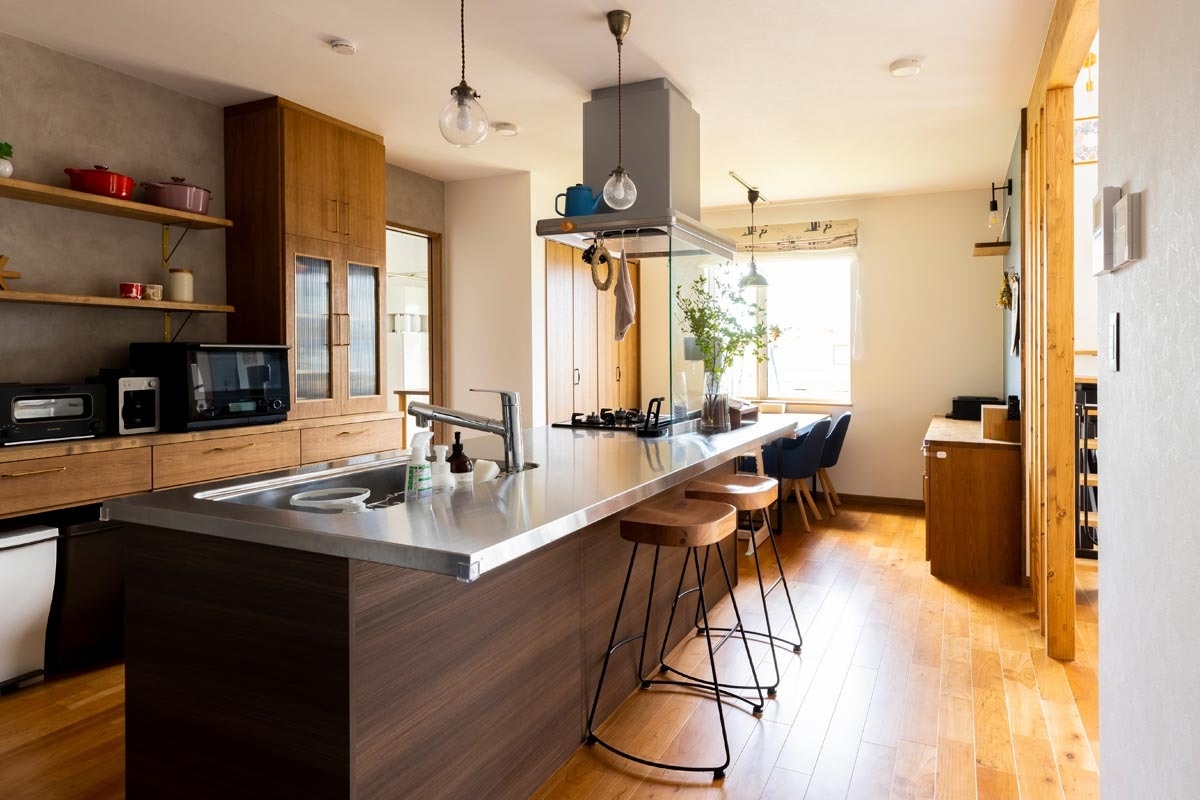 アイランドキッチンと一体になったカウンターは幅を広く造作し、ダイニングテーブルとして使用。側面にも椅子が置けるので、友人や親戚が集まった時にも大勢で食卓を囲めます。