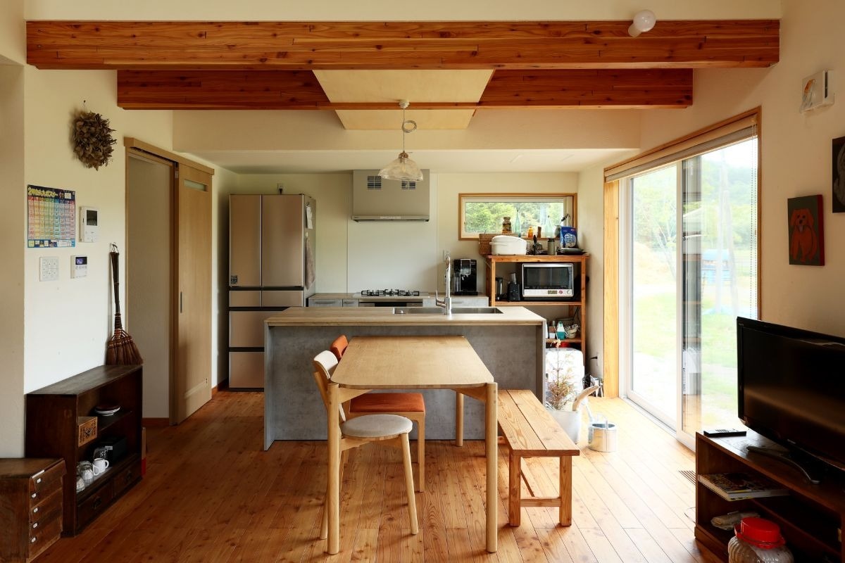 キッチンは施主の友人でもある木工作家、内田悠さんの作品。ナチュラルな木製のキッチンが、リビングの白い塗り壁や構造材ともよく馴染んでいます。
