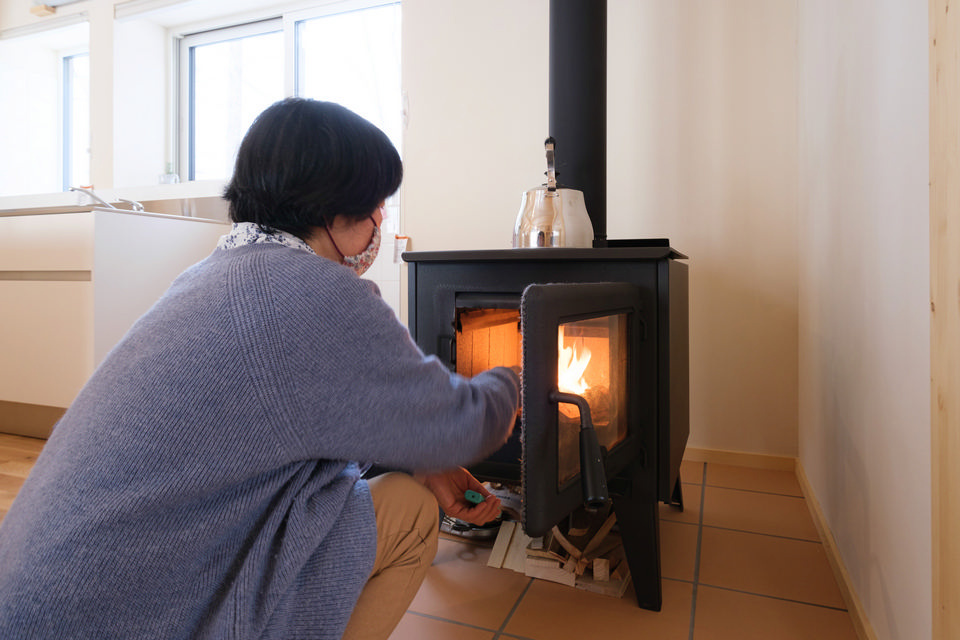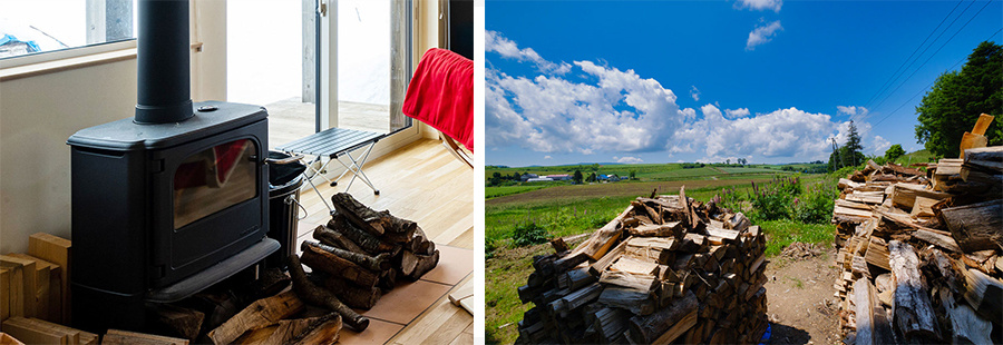 薪ストーブの生活も佐藤さんにとって初めての経験。「万が一、点火できなかった場合に備え、美瑛の真冬の寒さでも十分な暖房能力のある寒冷地向けエアコンを付けたので不安はありませんでした。朝は焚き付けが面倒だからエアコンを使いますが、やっぱり炎が見える薪ストーブがいい。友達にも好評です」。