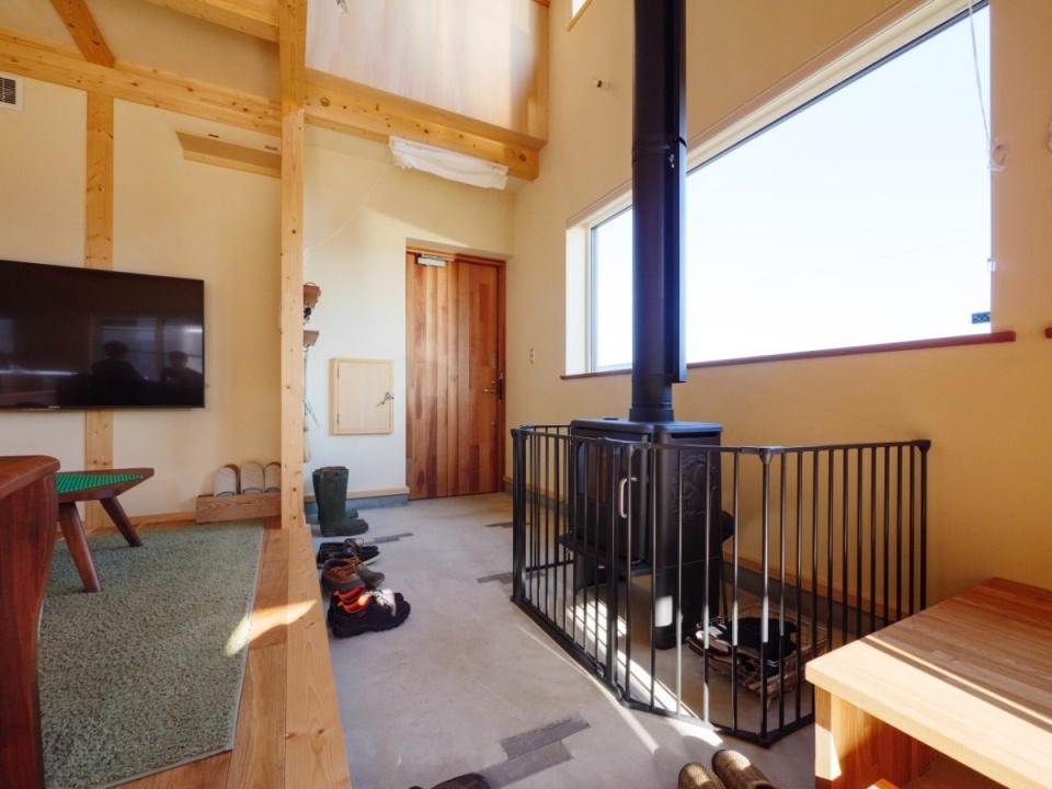 玄関から入ると、吹き抜けのある土間とLDKが一体となった大きな空間が見渡せます。大きな土間には、デンマーク、morso(モルソー)製の薪ストーブがありました。設計施工を担当した藤井工務店の藤井光雄さんは「モルソーはデザインの良さも魅力ですが、薪ストーブの経験が無い人でも『焚きやすい』のが魅力です」と言います。