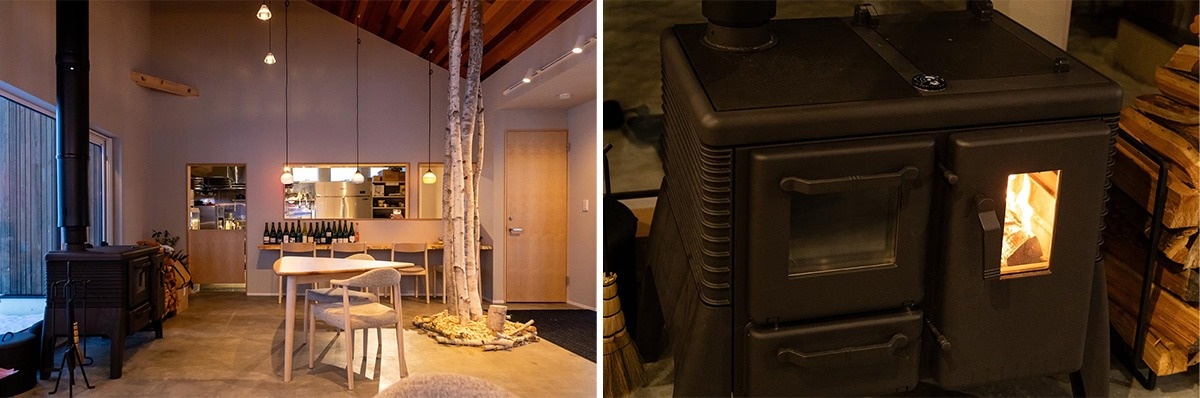 薪ストーブのある窓辺には、カフェ・スペースのようなプラスαの空間があります。薪の炎を眺めながら過ごす時間は格別でしょう。