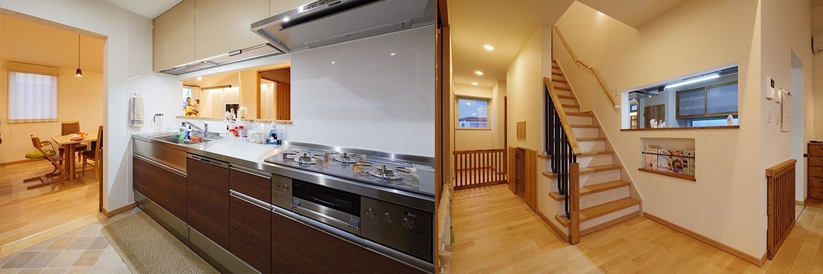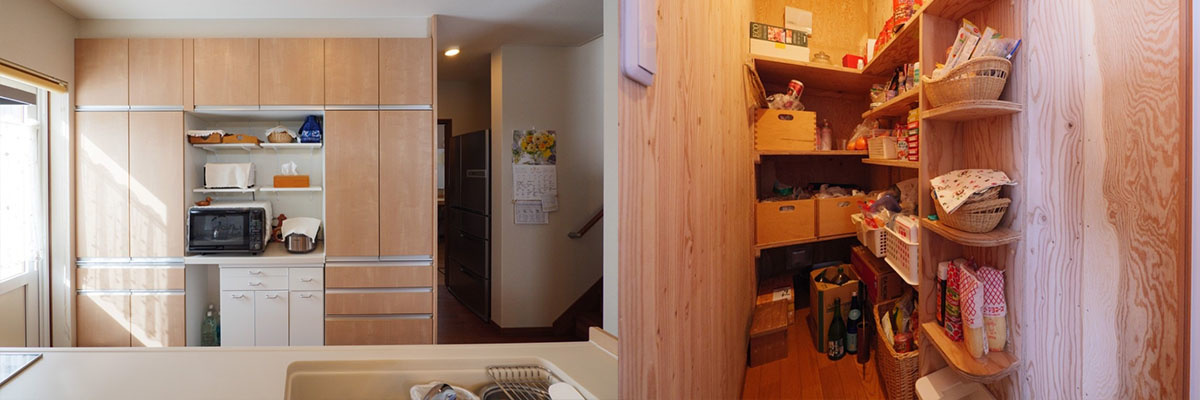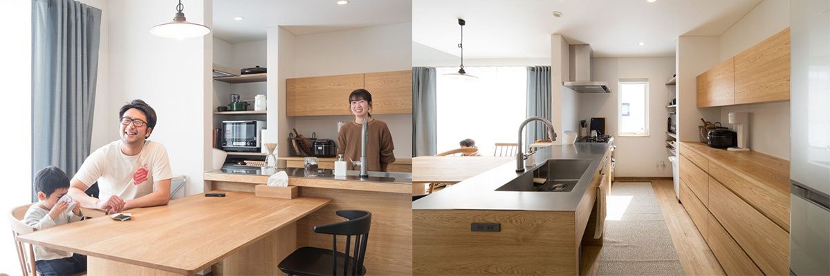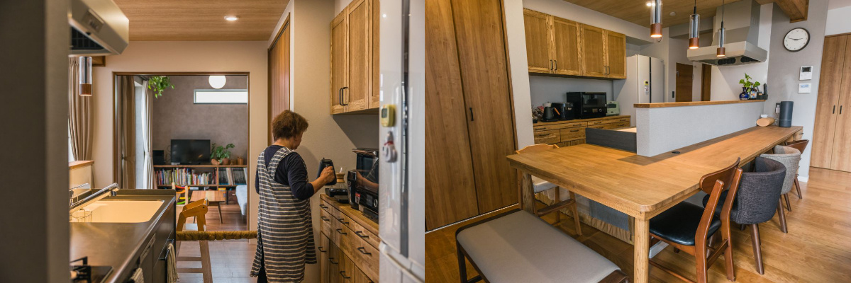 そば打ちやパン作りなど多彩な趣味をお持ちのお母様。キッチンは調理器具がぎっしり入る大容量の収納など、お母様の要望を中心にプランを練りました。「自室にもそば打ちの台を作ってもらいました」と笑顔です。プラスワイド社の建てる家の大きな特徴のひとつが、建具職人が制作するこうした造作家具。大工では実現が難しい要望にもきめ細やかに応え、できあがりも緻密な仕上がりです。