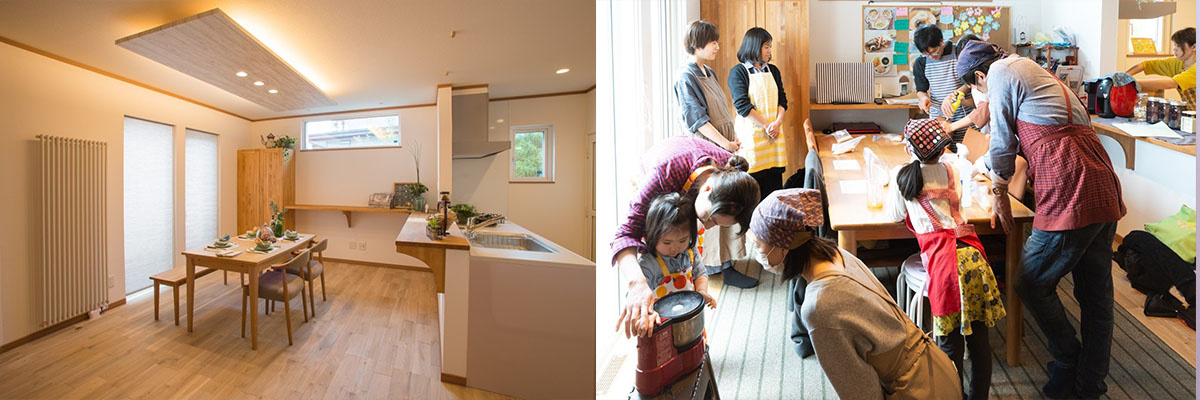玄関から左はキッチンやダイニング、右はリビングです。「おうちサロン」を開催する場合、家族が過ごす空間と、お客様をお招きして教室を開く空間を分けることができると準備や運営、後片付けもしやすくなります。調理道具の収納力や、掃除のしやすさ、受講生さんたちが利用しやすいような広さなどに配慮しました。おうちサロンのできる家づくり 離乳食・幼児食の園田奈緒先生のご自宅/旭川・アーケン