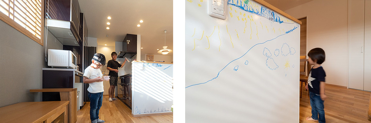 昭和木材のキッチン例 お絵描きができるキッチンの側面(旭川市)