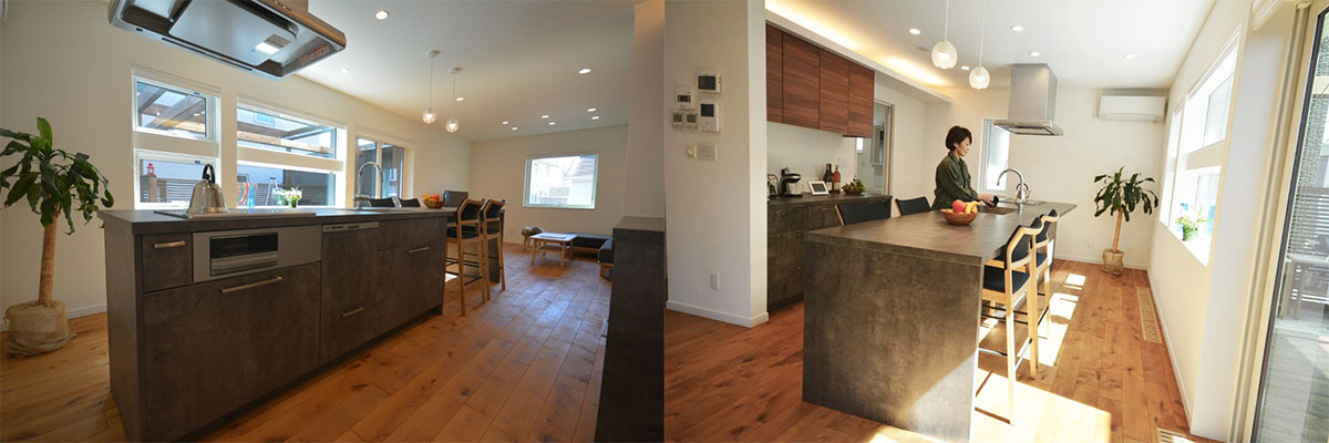 奥様は太田さんとご主人にキッチンのテイストを相談。話の弾みで「じゃあコンクリートでやってみよう」と決まりました。やり直しが利かない珍しい工事でしたが大のお気に入りです。