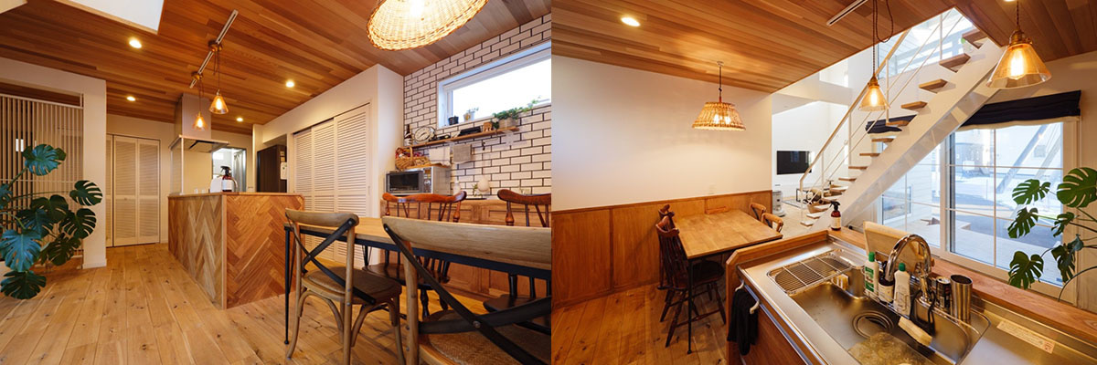 キッチンは既成品に、外周は大工の造作で「フィッシュボーン」を採用し室内の雰囲気に合わせました。食器や炊飯器、調理用品などを収納するカップボードは生活感を出さないようにルーバー扉を選びました。また、使い勝手が良いように両側にスライドする工夫を施しています。照明やダイニングテーブル、小物類はオーナーが自らインターネットなどで探して購入していますが、一部の収納家具は職人の造作です。カリフォルニア系注文住宅 デザイン・仕様を思い通りに実現/帯広市U邸・株式会社石井建設