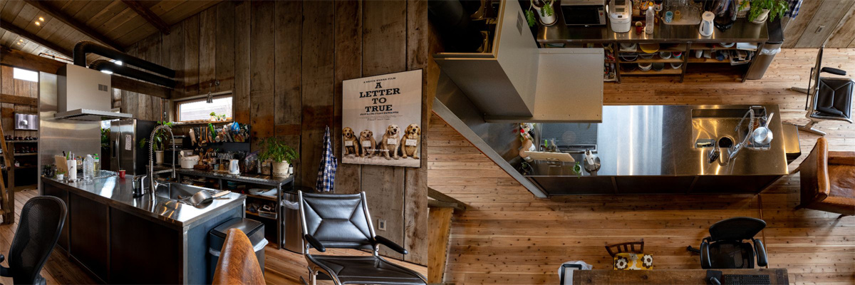 キッチンは、天板を厨房機器メーカーで、フレームを鉄工所で特注。溶接の跡を残し、塗装せず素材感を出しています。