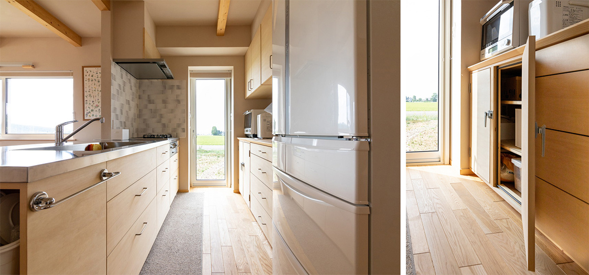 画像右側のカウンター下には小型の気密食品庫を備えています。断熱・気密性能の高い家では、家の中に寒い空間がないため、野菜や漬物など、低温で保存したいものを置く場所がありません。そのため冬場、外気をとりこむ気密食品庫の設置をおすすめしています。