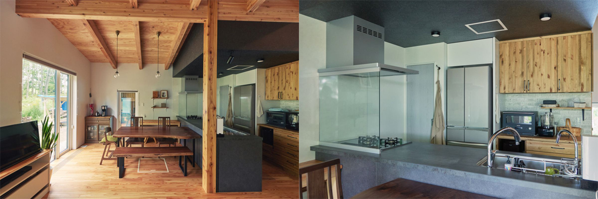 キッチンの天板はセラミックトップ、素材感にこだわりグレードの高いものを選びました。黒い天井は「薪ストーブを使うので汚れにくい色がいいとおすすめしました」と円さん。LDK全体の雰囲気を引き締めています。食器棚は音更町の家具工房FARMER’Sでオーダー。イメージどおりのジャストサイズになりました。