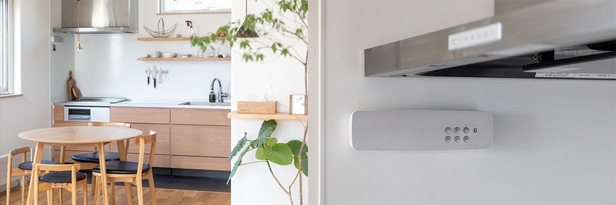 キッチンパネルにはBluetoothで音楽を視聴できるタカラの「どこでもスピーカー」が。(現在はメーカー販売終了)