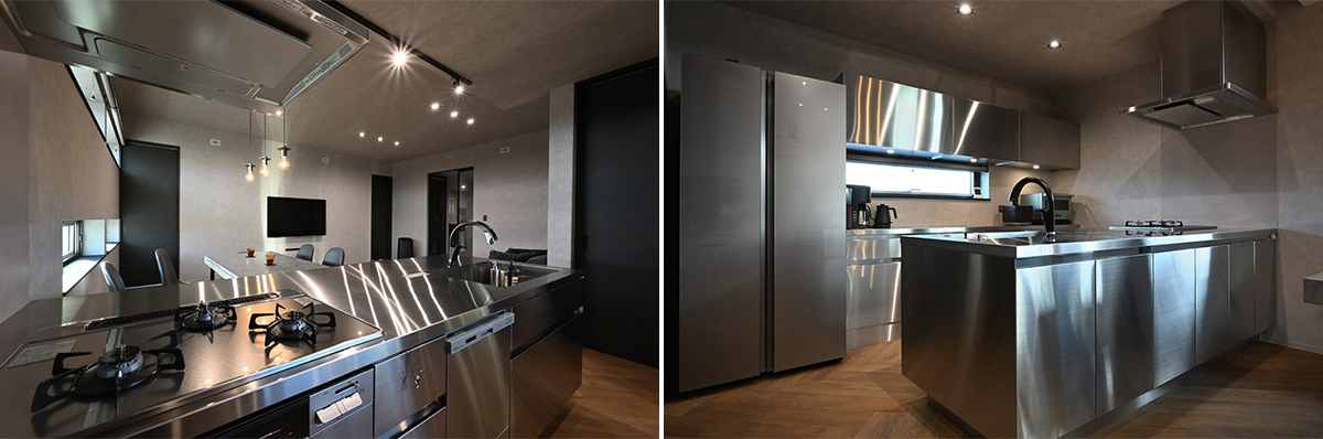 キッチンも背面収納もオールステンレスを選びたくて、サンワカンパニーのGRAD45(グラッド45)を採用しました。デザインで選んだので気に入っています。指紋や多少の傷は付きます。建具もサンワカンパニーの製品を多数使っています。