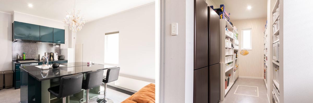 キッチンの横には約4畳の大きなパントリーを完備。冷蔵庫や電子レンジもピッタリ収まっています。食品をはじめ掃除用具なども収納して家全体の生活感をなくしました。