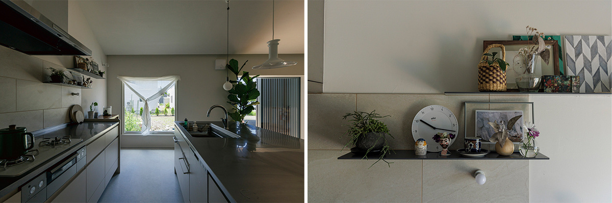 写真右は「鉢植えの重さに耐えられるものを」とリクエストしたキッチンシェルフ。鉄工所と相談して作ったぎりぎりの薄さです。さらに棚受けをつけず、壁の裏側で支えることで棚としての存在感を消しています。