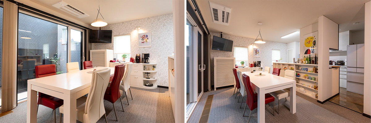 中庭に面したダイニング・キッチン。リビングとは独立した造りです。奥さまがキッチンに立ち、ご主人がダイニングに座りながら、おしゃべりを楽しんだり、テレビを見ながら食事をしたりと、ご夫婦が一番長く過ごすスペースになっています。