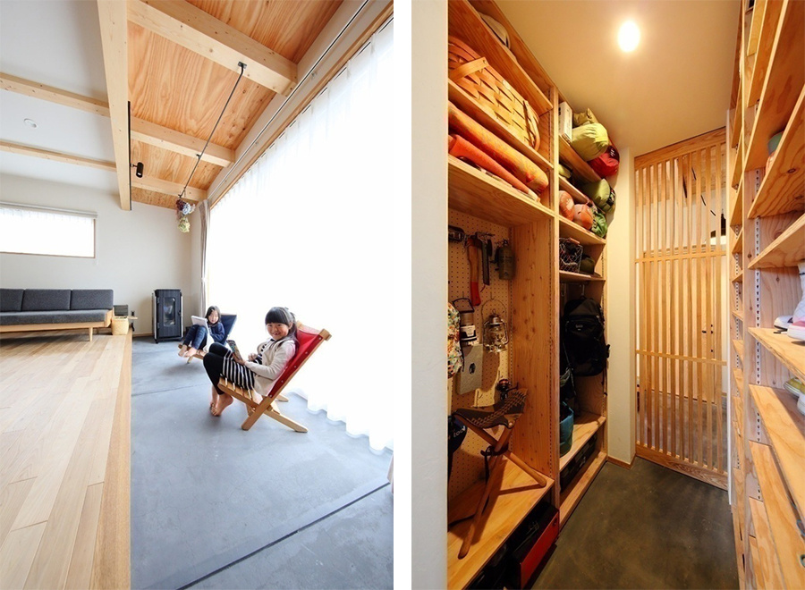 「昔の、土間や囲炉裏があるような家の雰囲気が好きで」とご主人がこだわったのがこちらの土間です。一見居住スペースを圧迫しそうですが、玄関・収納・趣味・来客対応・そして安らぎの空間といった多種類の役割を果たしています。大容量の棚に収納されているのは、キャンプ用品やヘルメットなどアウトドア好きというご主人の趣味のアイテムたちです。居室部分から緩やかに区切られた土間に設置したことで、単なる収納ではなく“基地”感のある趣味のコーナーとなりました。