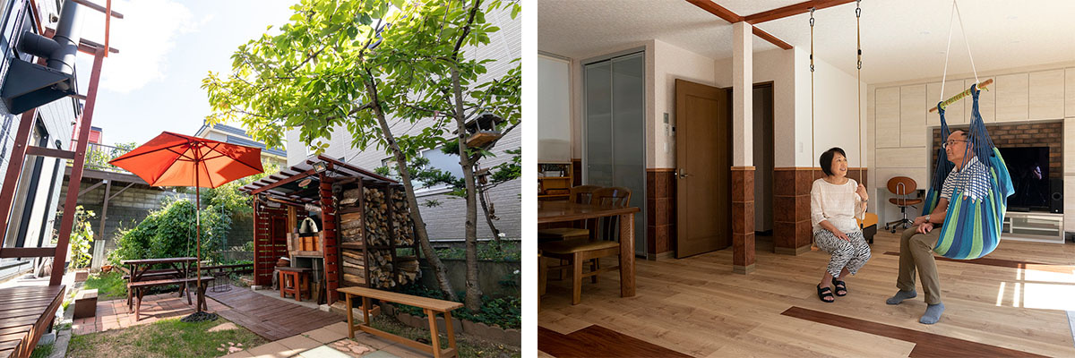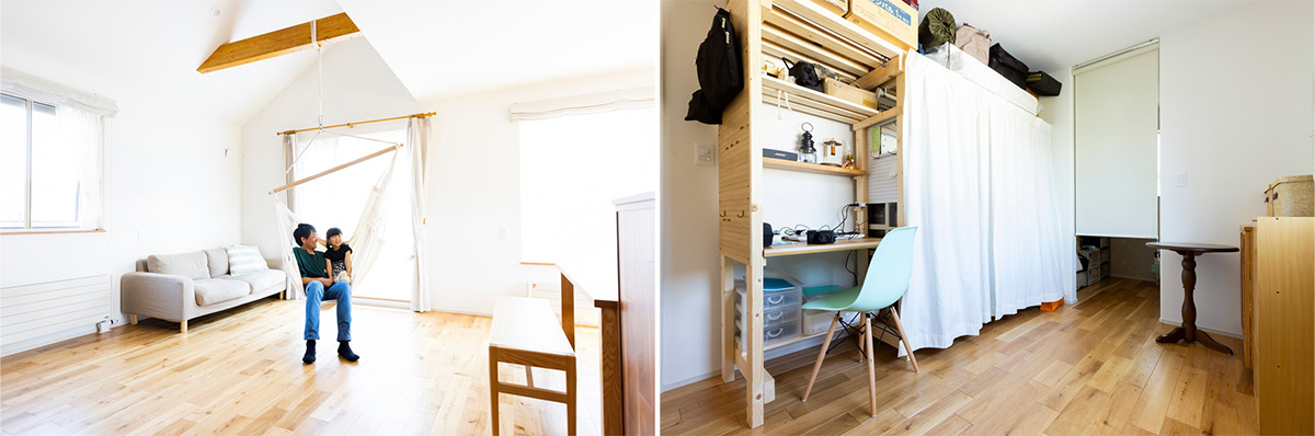「ソファを置かずに暮らしています。ハンモックは本当に気持ちがいい。ブランコは孫が遊びに来た時、大喜びしています」。