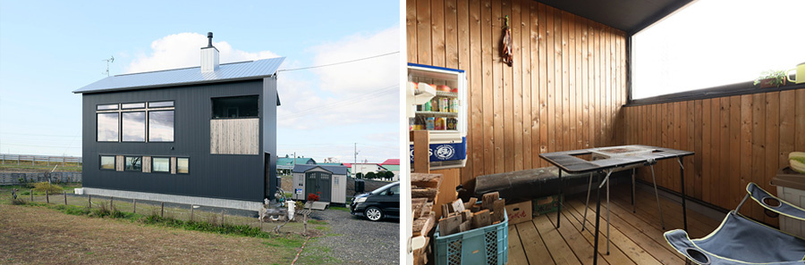 仕事から、ちょっと離れて休日を楽しむため当別町にセカンドハウスとして建てた、オーナーのHさん。普段は札幌のマンション住まいで、お休みの時は当別の家に滞在してリフレッシュしています。周囲にさえぎるものがないので眺めも抜群ですが、強風や吹雪にもさらされるため、玄関付近に風よけのルーバーや、住宅に組み込んだ物置などを設置しました。