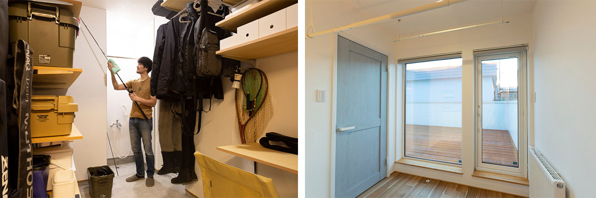 玄関の土間収納はウォークスルータイプにして、アウトドアや釣りの道具を収納するスペースに。その先に「釣り部屋」を配置しました。