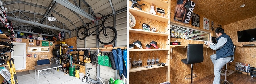 カルフォルニア系デザインのガレージが欲しかったご主人。アーケンの藤原社長に相談し、旭川の積雪荷重にも耐える、しかもデザインの良いガレージを購入しました。スノーボードやスキーなどのアウトドア用品は壁に設置、保管できます。自転車やキャンプ用品も壁に掛けられます。そしてこのガレージの奥には部屋があります。ガレージ内部に、木造で小屋を作ったのです。好きなスポーツのグッズなども並ぶお気に入りの空間です。