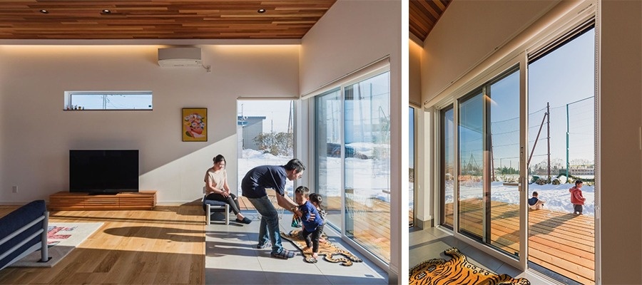 屋外の広々としたサンデッキと土間がフラットにつながっていることで、屋外と室内が緩やかにつながる明るく気持ちのよい縁側のような場所になりました。春になったら畑や芝生を作りたいと検討中のパパとママよりも先に、姉弟は広い雪原とサンデッキを満喫しています。