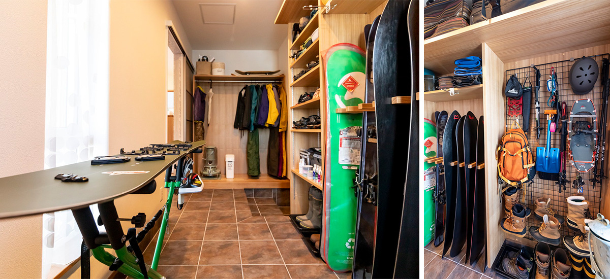 玄関の土間続きには、本格的にスノーボードを楽しむご主人の趣味スペースがあります。