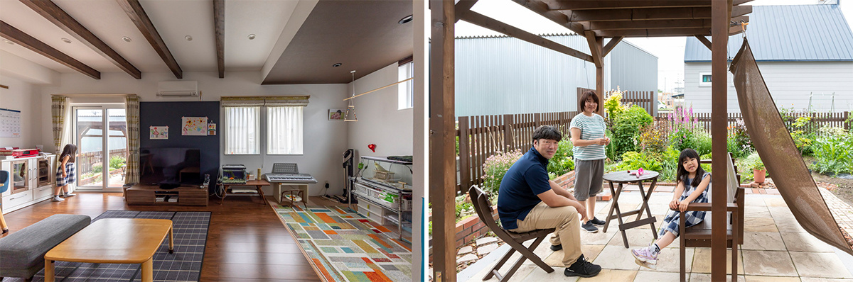LDKから続くガーデンテラスはご主人のお手製です。庭の手入れをしたり、家庭菜園の実りを収穫しながらバーベキューをしたり。「コロナ禍のおこもり生活も楽しめました」。