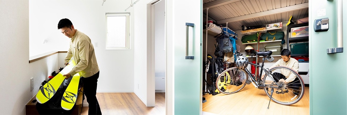 バックカントリースキーは装備類が多く、大小30くらいの装備を持つそう。大きいものだけでもスキー、ブーツ、バックパック、ヘルメットなどが必要です。ほかにも釣りやキャンプなどが趣味のSさんは、アウトドア用品を収納するスペースとして、専用の物置も設置しました。自転車のメンテナンスもここで行っています。