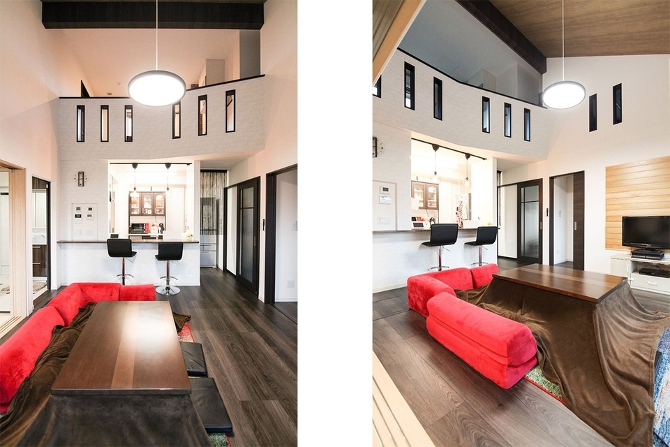 リビングにこたつがある理由については、本州出身のご主人によると「北海道の人は、室温を24℃など高めにして、冬でもTシャツにビール、という話を聞きますが、生活するうえで私たちにはそこまでの室温は必要ないですし、エネルギー消費的にも環境への負荷が増えそうな気がします。高断熱高気密住宅を建てる前提で、そのうえで冬の室温を20℃設定にすることで暖房消費エネルギーをさらに減らし、本州のように自然に家族がコタツにあつまって団らんできるリビングがいいかなと思ったんです」と話してくれました。