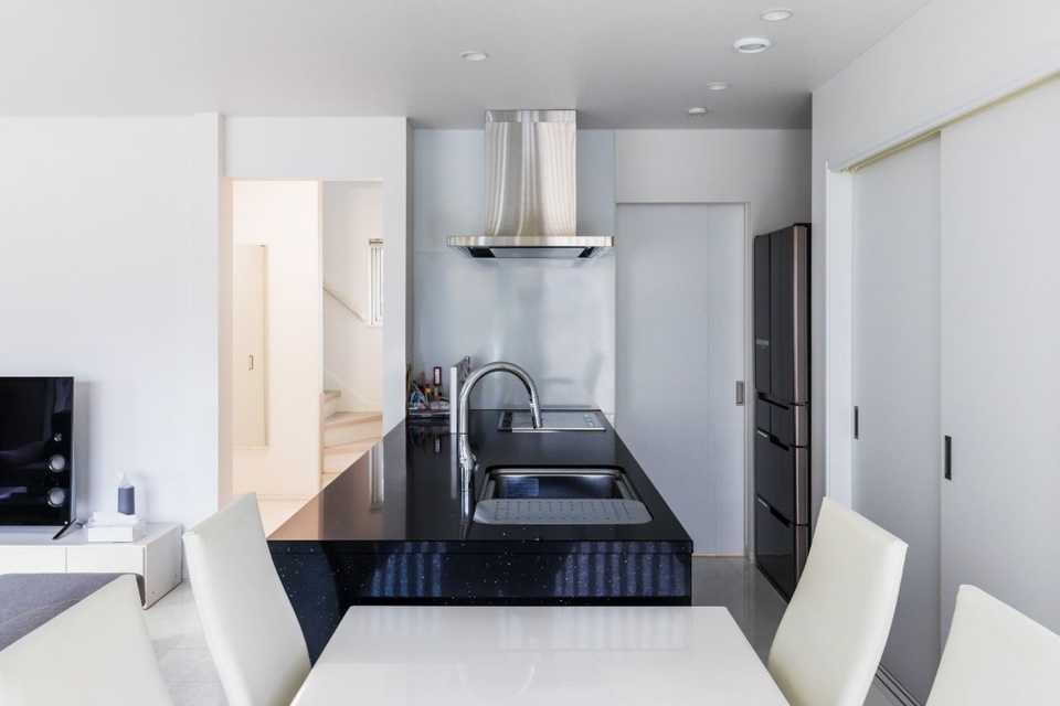 帯広市の人気エリアに建てられたU邸は、子育てのしやすさと洗練されたホテルライクな空間とを両立させたこだわりの一棟です。「すっと背筋の伸びるような、ホテルに来たような気持ちになれる家にしたかった」と奥様。最もこだわったというキッチンは、水晶をちりばめたタカラの黒いクォーツストーンのワークトップ。白い大理石調の床によく映え、全く生活感を感じさせません。