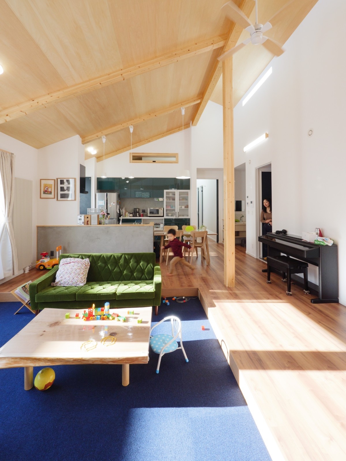 さらに天井を通常より30センチ高くしたことで、広さを感じられるリビングになりました。キッチンも含めて、1階全体が “大きなワンルーム”のような造りです。