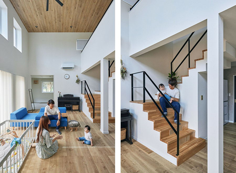 北斗市Tさんのお宅。リビングは2階の天井までの高さがある吹き抜け空間です。解放感も魅力ですが、子ども部屋とリビングとの間で、親子のコミュニケーションがしやすいのも吹き抜けのメリットです。T邸は、きわめて高性能な高断熱高気密住宅なので、そもそも室内の暖かい空気が屋外にほとんど逃げません。少ない暖房エネルギーで家じゅうを暖かく維持でき、床下に1台設置した6畳用エアコンから家じゅうに暖気を送る方式なので室内に暖房機を設置する必要すらありません。