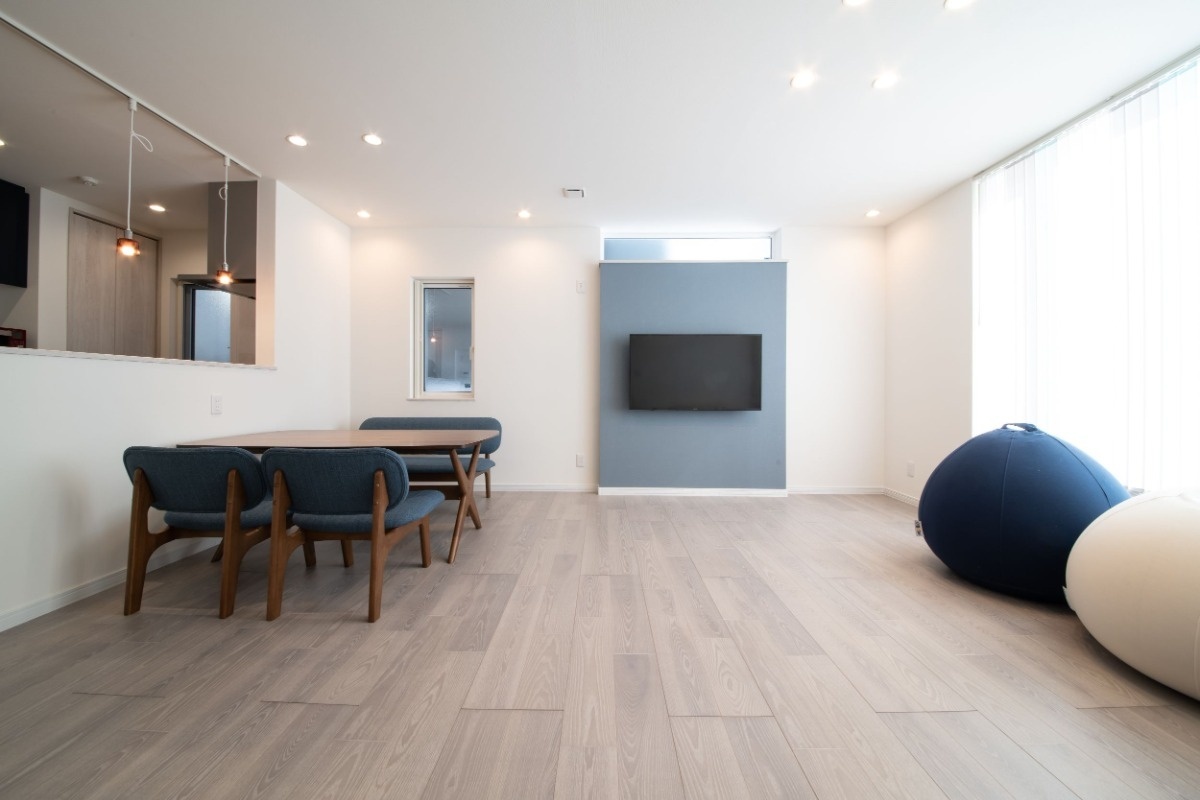 「室内はあまりモノを置かず、すっきりとした空間にしたい」と要望したご夫妻。リビングルームはホワイト系の壁クロスと淡い色合いの木調フローリングで開放的に、ネイビーカラー(ブルーグレー)のアクセントクロスが空間を引き締めています。