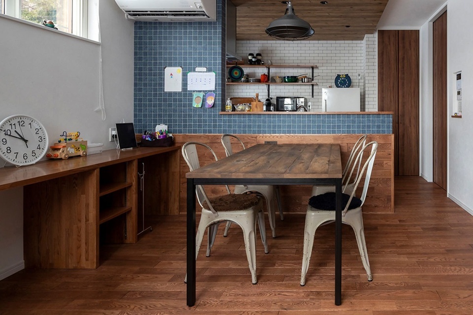 ダイニングはキッチンカウンターまわりにブルーのタイルと木をあしらった北欧調カフェスタイル。