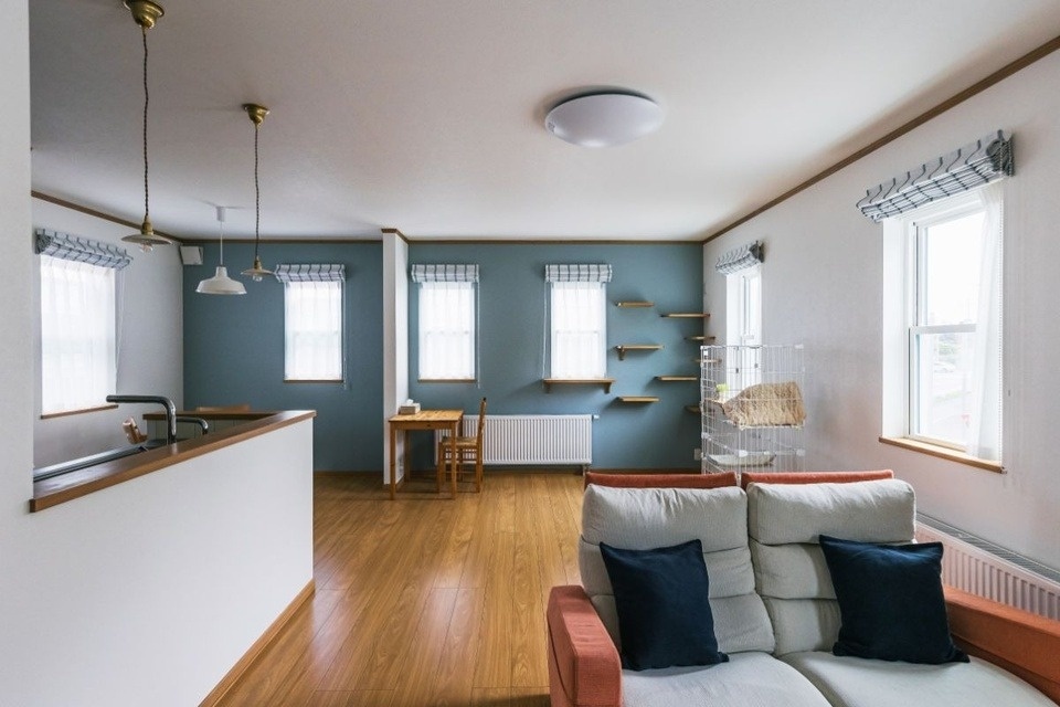 LDK は 2 階。アクセントカラーにブルーグレーを使いました。2階リビングの魅力は、何と言っても見晴らしが良いこと。保護ネコのぴっち君もキャットウォーク付きの新居の窓から中札内の景色を眺めています。