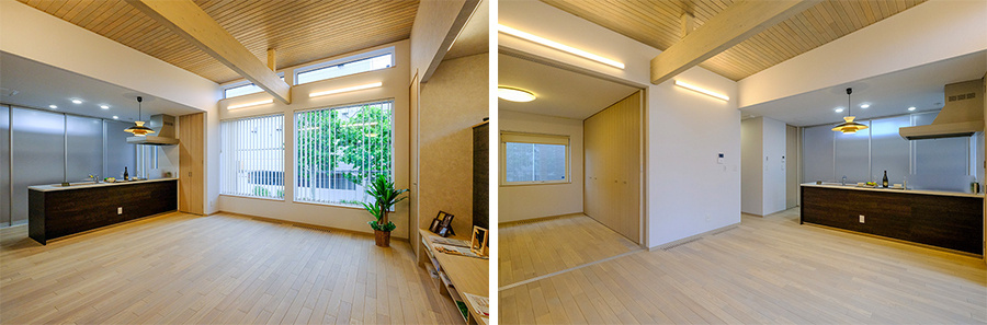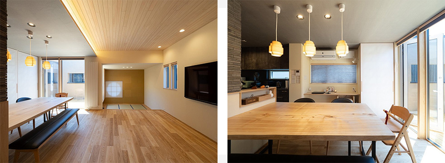 希望したエリアに見つかった土地は南向きの好立地でしたが、敷地面積は40坪を切る狭小地。老川さんの提案でより採光を確保しやすい2階リビングのプランになりました。階段を上がると広いオープン・キッチンがあり、その奥にリビング・ダイニングが広がっています。リビングの天井はヒノキを使った羽目板仕上げ。床はタモの無垢材です。ダイニングの天井は間接照明を施し一段低くなっていて、天井の美しい木目が照らし出されています。