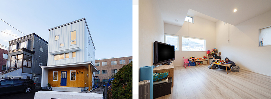 「Bruno(ブルーノ)」という店名から連想される、青いドアが印象的なヘアサロンは、札幌市西区平和に2017年2月にオープンしました。立開業は美容師の夢。予算内で、お客さんや家族にも快適な店舗兼住宅を!というヘアスタイリスト・松口さんの願いが、ローコストとアイディアならおまかせの、白田建築事務所によってかなえられました。