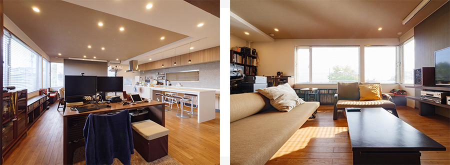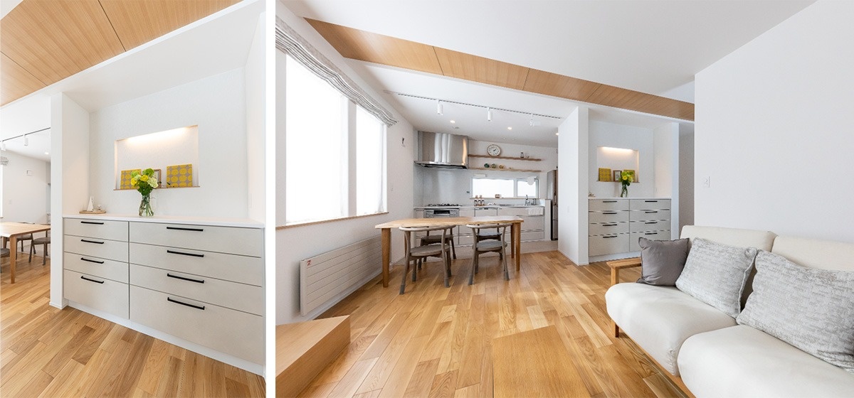 奥さま「外から見たら寝室がこんなに広いとか、こんなに使い勝手のよいキッチンがあるとか、想像がつかないと思います。見たい人がいるならどうぞと言いたいくらい(笑)。今は家の中の移動が楽です。ベースが中2階のリビングで、使いやすくて住みやすい。やっと普通の暮らしができると感動しました。アーキテクトノエルの稲村さんと、リーベンホームの野村さんには本当に感謝でいっぱいです」
