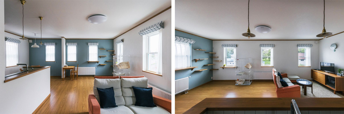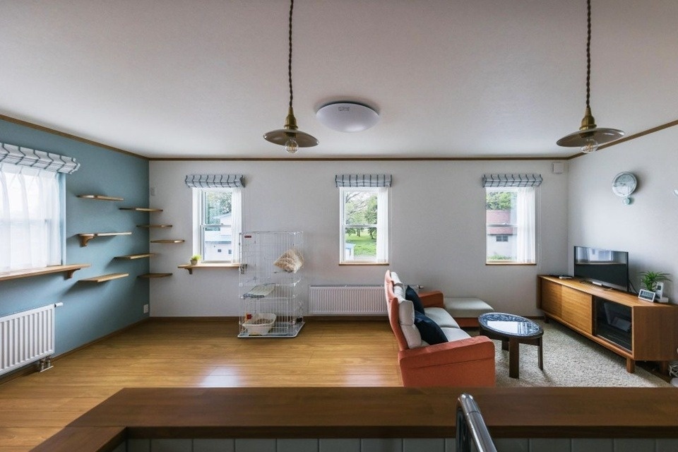 住居は2階にあります。2階リビングの魅力は、何と言っても見晴らしが良いこと。保護ネコのぴっち君もキャットウォーク付きの新居の窓から中札内の景色を眺めています。