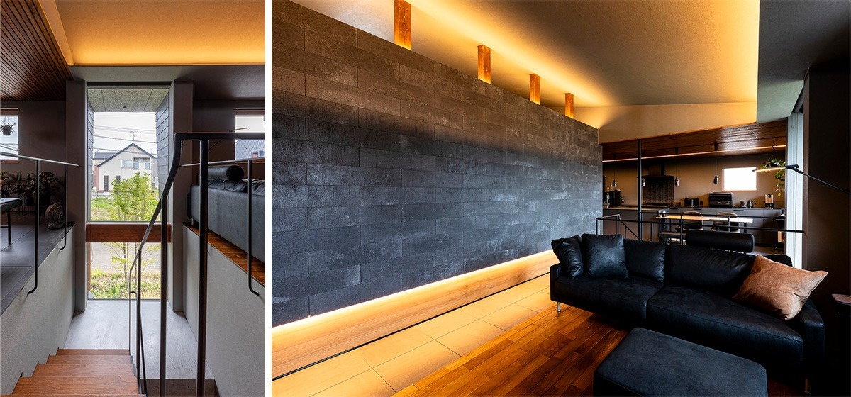 通路沿いの壁には、2階部分の外装にも使われているシングルスレートを貼り、間接照明をプラン。ラグジュアリーな空間に仕上がりました。