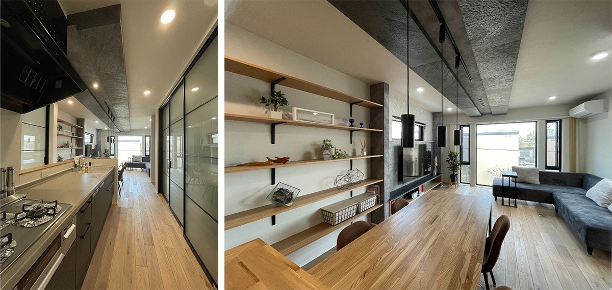 狩野社長 2階LDKは限られた広さで開放感をもたせるため、開口部を大きくとりました。キッチン天井を少し下げて高級感を出す仕上げ方がよくありますが、Yさまのお宅では空間をより伸びやかに見せたいと思い、意匠性の高い天然石仕上材「ストーンスタイル」をLDK天井の端から端までライン状に貼り付けています。