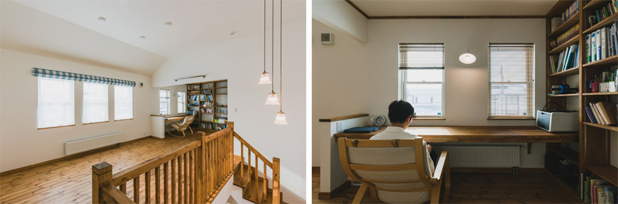 階段を上りきった場所はフリースペース兼書斎になっています。オープンな方が色々な用途に使える、とあえて壁などで区切らず家具も置いていません。書斎では静かに本を読むほか、パソコンを使ったり勉強をしたりと誰でも使えるスペースです。本好きのご主人のため、天井まである本棚を造作で作りました。