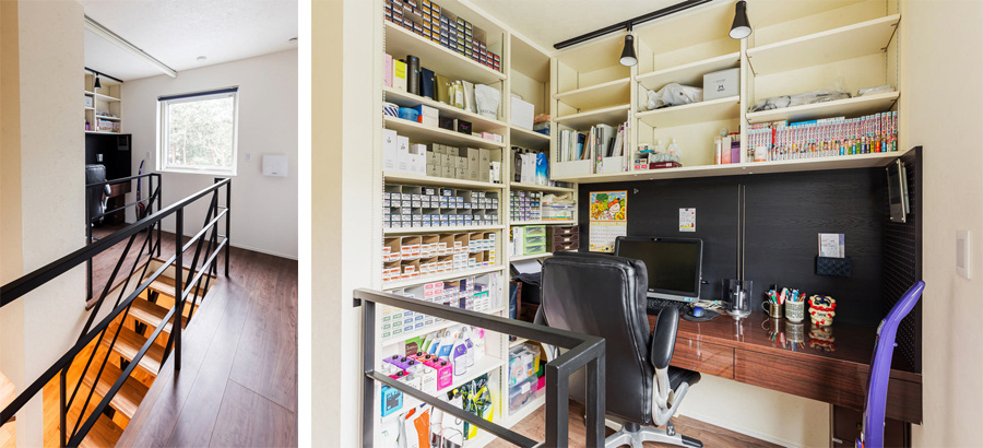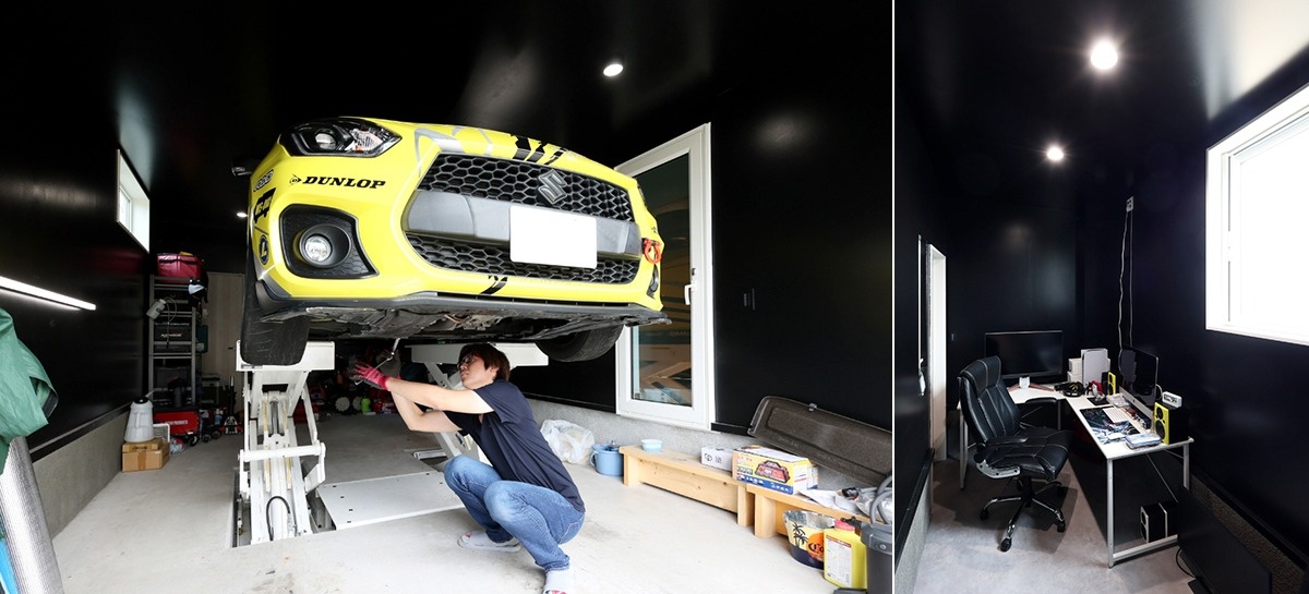ガレージ奥の書斎スペースは、ホールからも出入りができる回遊式です。「妻が撮影してくれた運転動画で走行をチェックしたり、動画の編集をしたりしています」とご主人。動画で車高などを確認して、ガレージですぐに調節できる環境が整い、ドライビングテクニックの向上にも役立っているそうです。