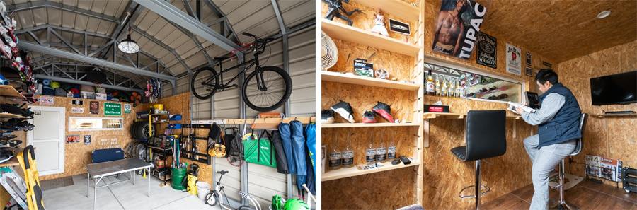 そしてこのガレージの奥には部屋があります。ガレージ内部に、木造で小屋を作ったのです。好きなスポーツのグッズなども並ぶお気に入りの空間です。仕事でも趣味でも、ものづくりや整備が好きで、このガレージは、それを満喫できる空間なのです。