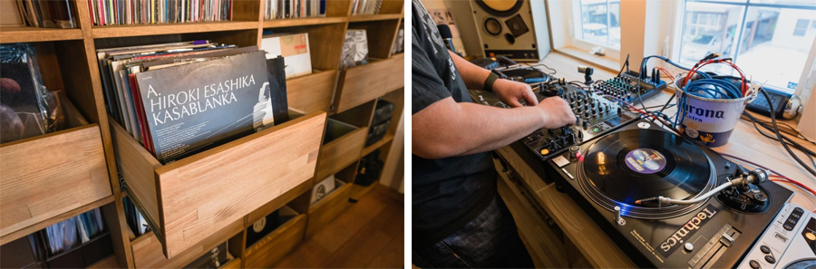 レコードを収納する棚はもちろん造作。レコード店などで見るような引き出し型で、収納とディスプレイを兼ねています。