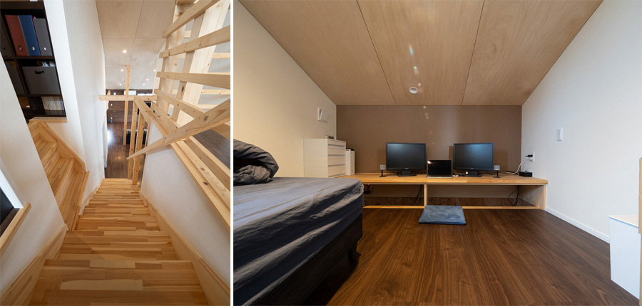 仕事を持ち帰ることも多いMさん、はじめは2階ホールに簡単なカウンターでもと考えていましたが、片流れ屋根の空いた空間を部屋に利用できないかと白田さんに相談。“囲まれ感”があって程よく集中できる、隠し部屋風の書斎ができました。机は造作でジャストサイズ、床は掘りごたつのようにくり抜いてあり、足を伸ばして座れます。