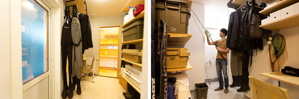 ご夫婦の共通の趣味はアウトドア。Kさんは特に釣りが好きで、釣り道具やキャンプ道具を収納するための専用室を希望しました。通称「釣り部屋」と呼んでいます。