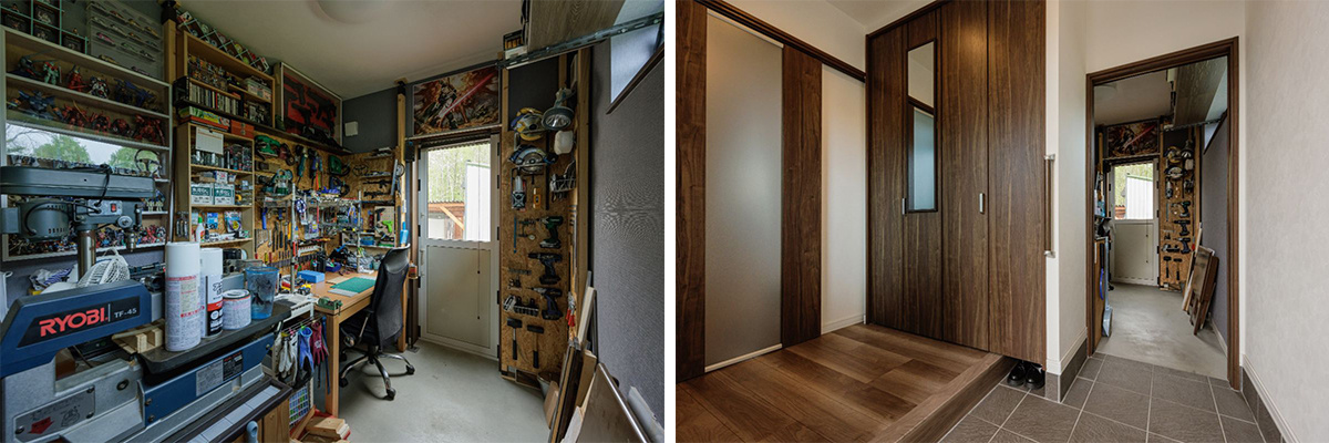 作業部屋の位置は玄関脇。友人から本棚やエアコン室外機カバーなどの制作依頼もあるというご主人にとって、車に工具や作品を積み込むのにも絶好の場所です。