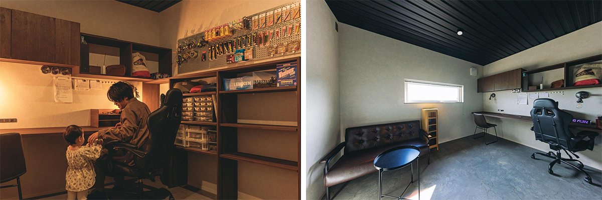 釣り部屋には毛ばり作りやリールの修理ができるカウンターもあります。釣り部屋から直接ガレージへ出られる間取りで、夜釣りに行くことも多いというご主人は、家族を起こさずに出かけることができるので便利だと満足の様子です。