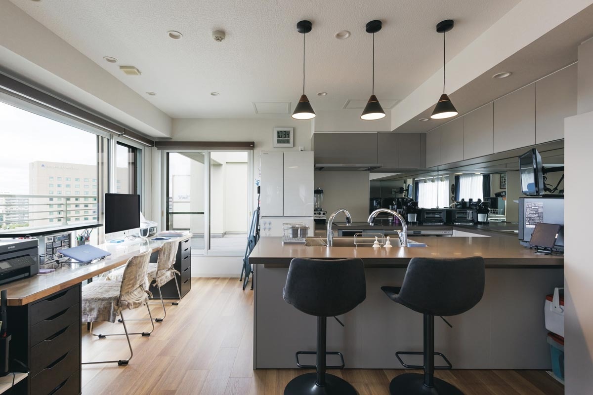 「あえて部屋にせず、いろいろな可能性を残したかった」という写真奥の空間はバーをイメージしたカウンターで空間が仕切られています。