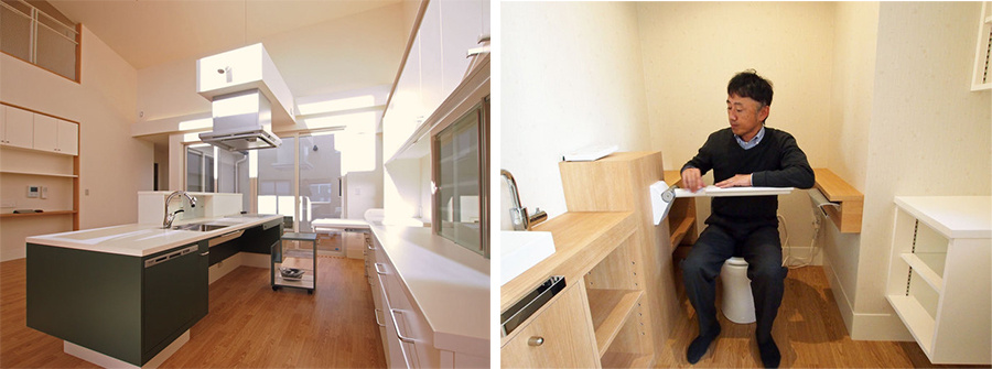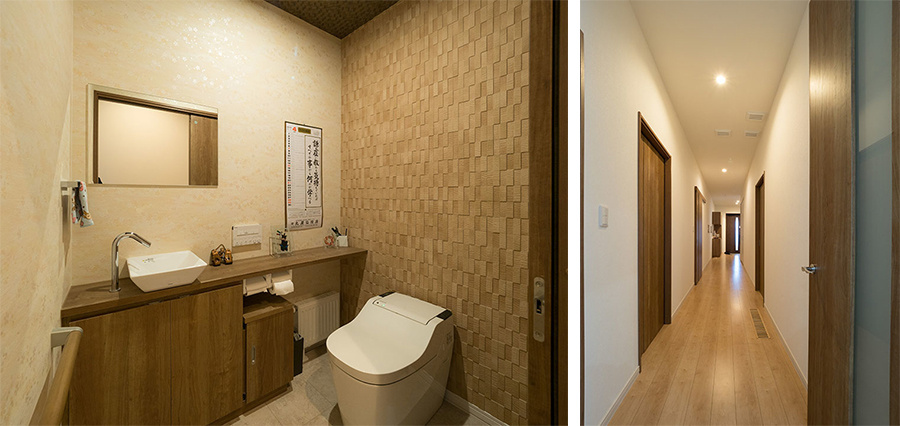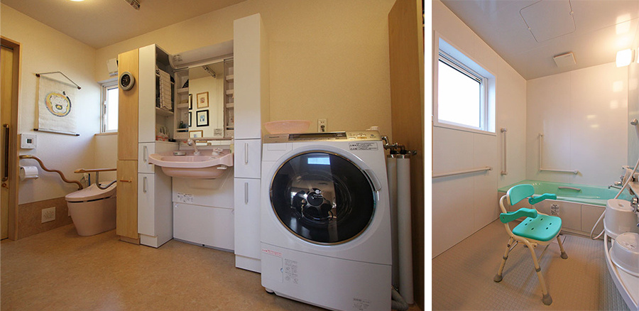 「車イスで暮らす家に必要な要素を、すべて設計に反映しました」と瀧本社長が話すように、回遊動線のほかにも、最大で約130㎝とった開口部、2方向からアクセスできるトイレ・洗面所、玄関や水回りの手すりといった設計に、将来を考えた工夫が見られます。